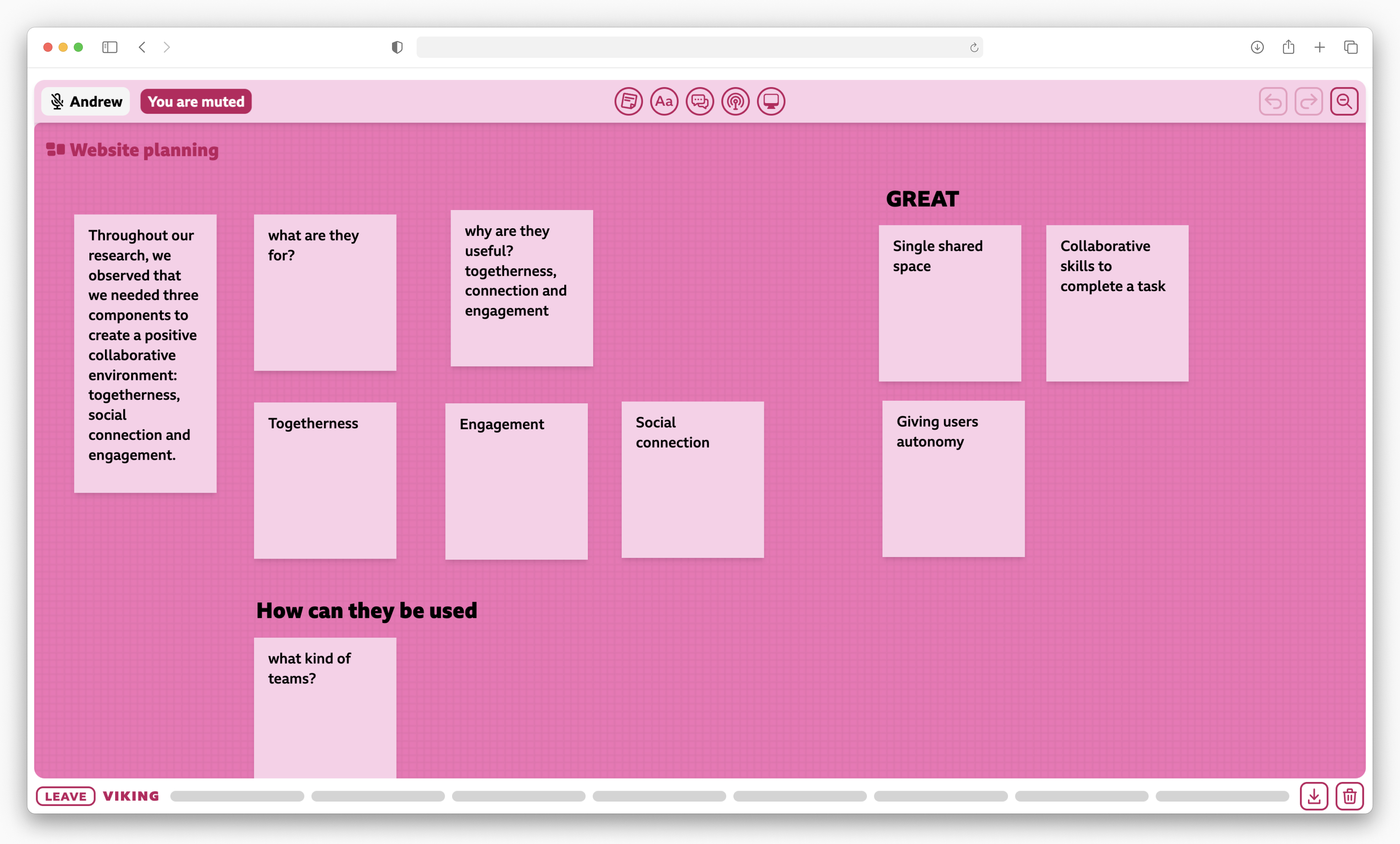 Work teams naturally have different roles and a common goal so we did not explicitly implement them. A user can move to another part of the canvas to work independently if they choose to. The rest of the team can still get an idea of what they’re doing through the icon in the cursor.
