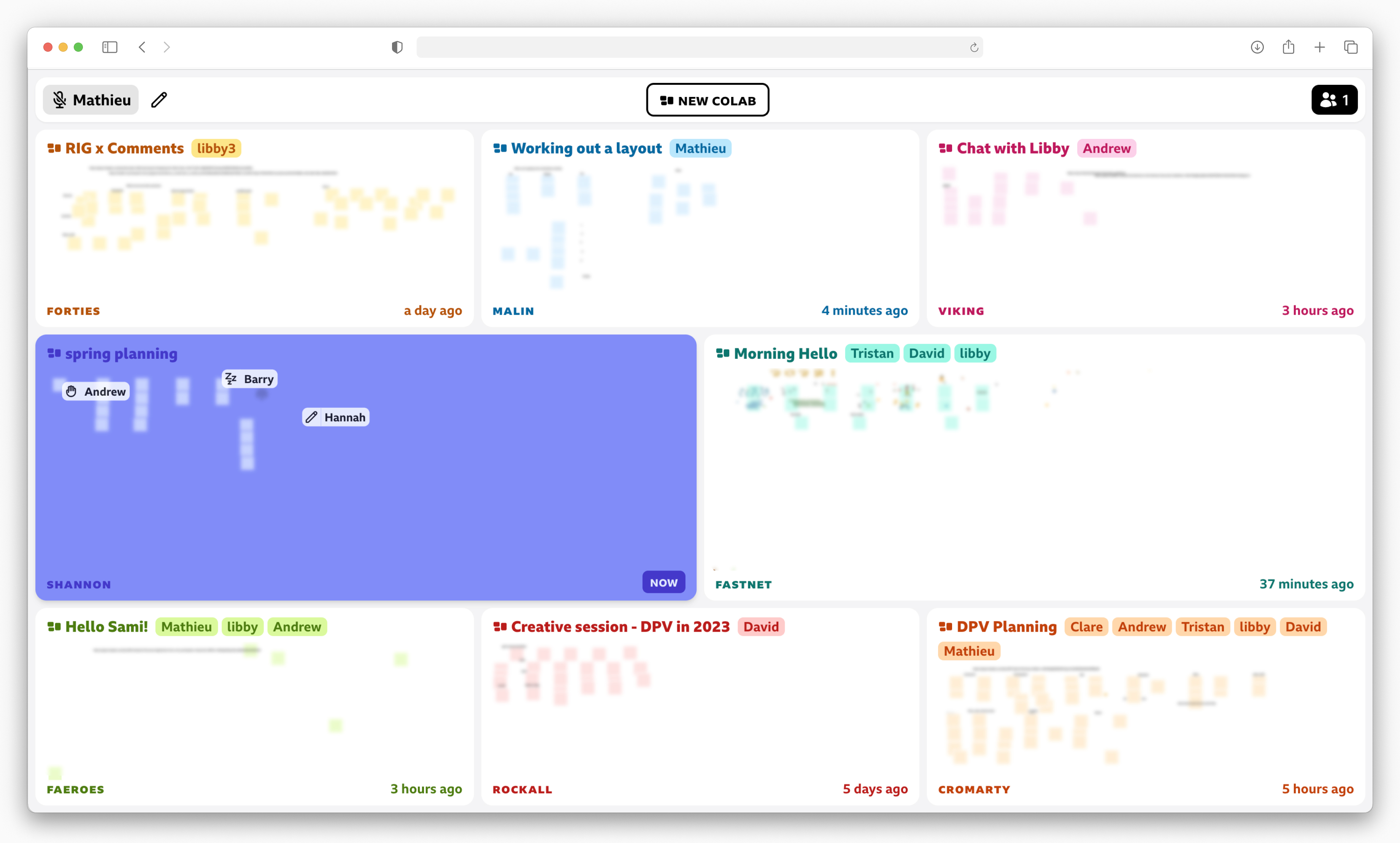 This overview of virtual collaboration spaces shows everyone and their activity. The live cursors show intention through movement and iconography. Past activity is displayed in the empty spaces which is essential for asynchronous work.