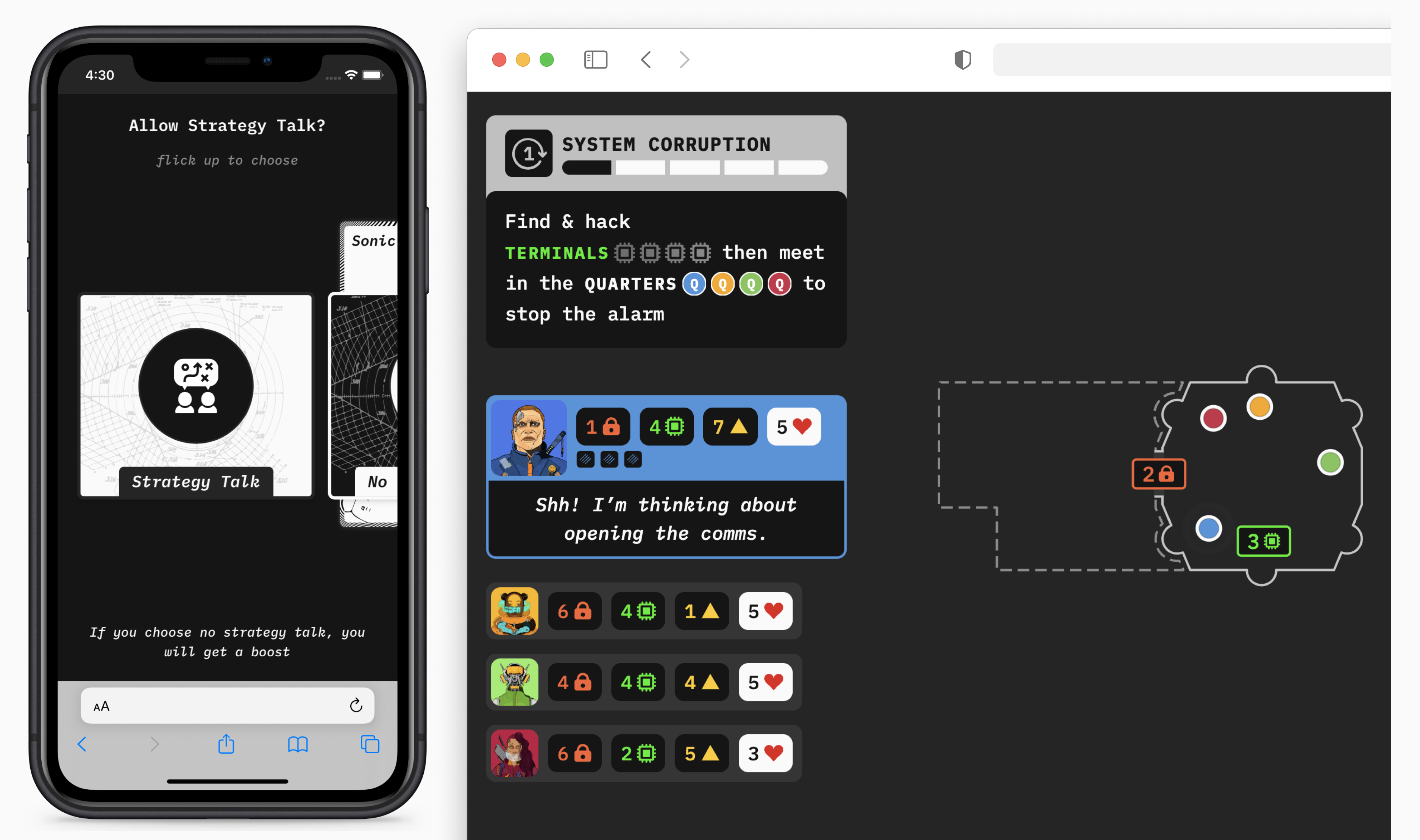 The top part shows the players’ goal and underneath there is a list of characters with their strengths and weaknesses. A player can choose whether or not to be independent for a turn (opening the comms).
